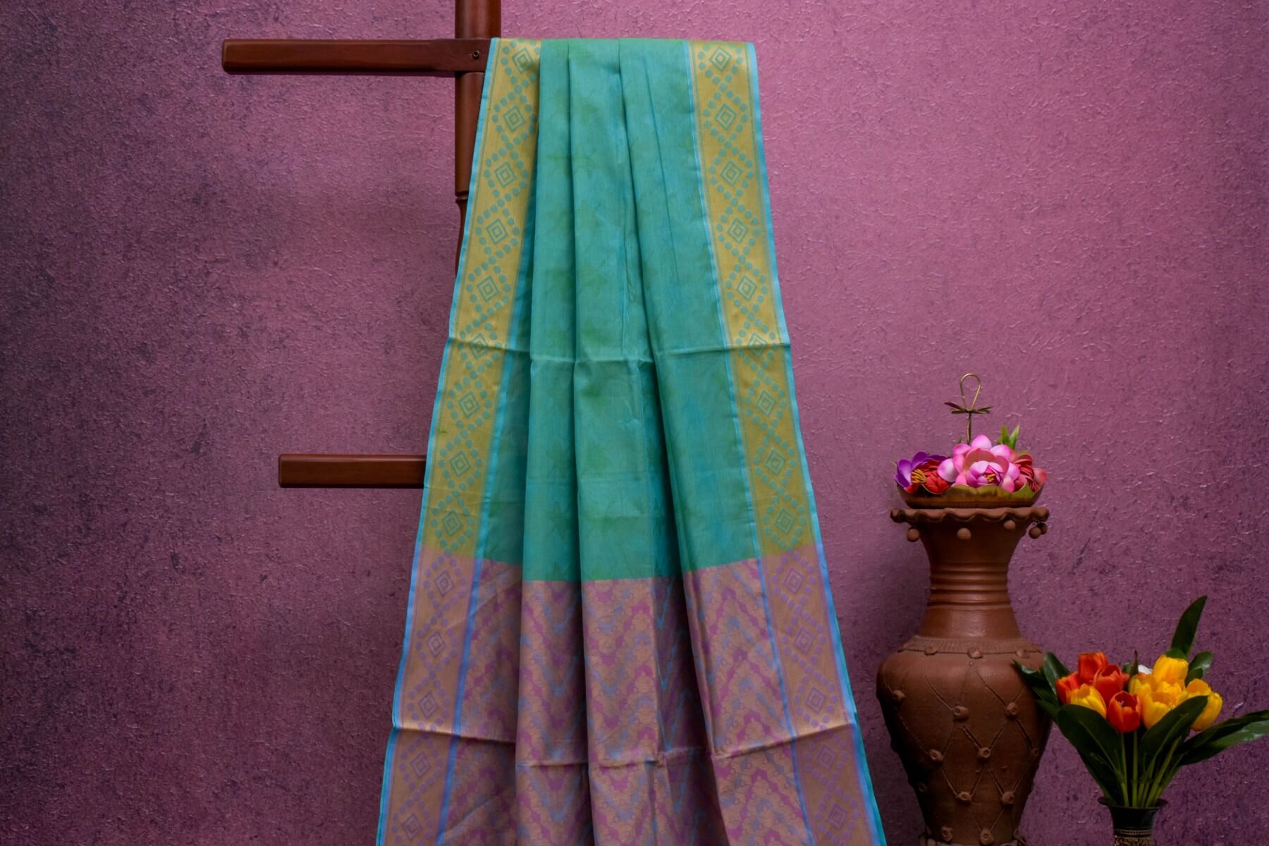 Experience the elegance of traditional Coimbatore cotton saree with the SS4569 model. Made with the finest quality teal cotton, this saree is perfect for any occasion. Its lightweight and breathable fabric provides comfort while its intricate design and vibrant color make it a must-have for any saree collection.