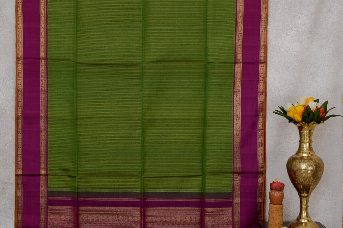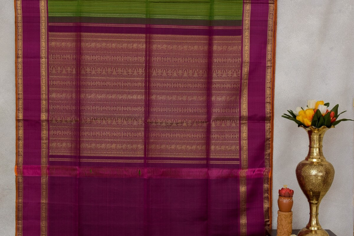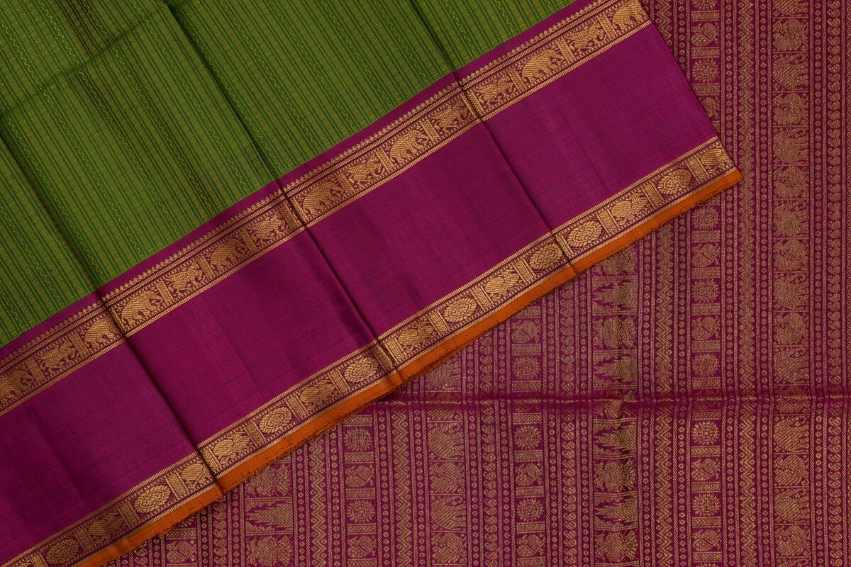 Expertly crafted with a vibrant green body and intricate yellow thread work, this Kanjivaram Silk Saree RB003 is a beautiful addition to any wardrobe. Finished with stunning magenta borders, paloo, and blouse, it exudes elegance and charm. Made from high-quality silk, this saree is both luxurious and comfortable to wear.