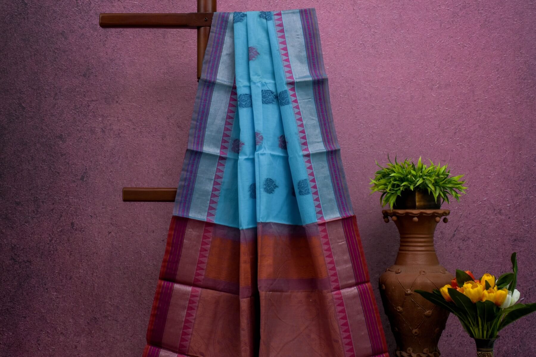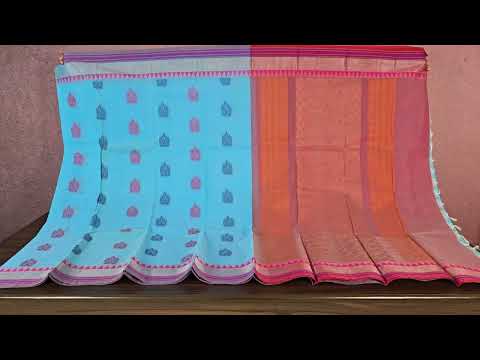 The Kora Cotton Saree SS4793 features a striking blue body and borders, complemented by a dual-tone paloo and blouse in red and off-white. Crafted for elegance and comfort, its rich color contrast enhances your sophisticated style while offering breathable cotton fabric perfect for any occasion.