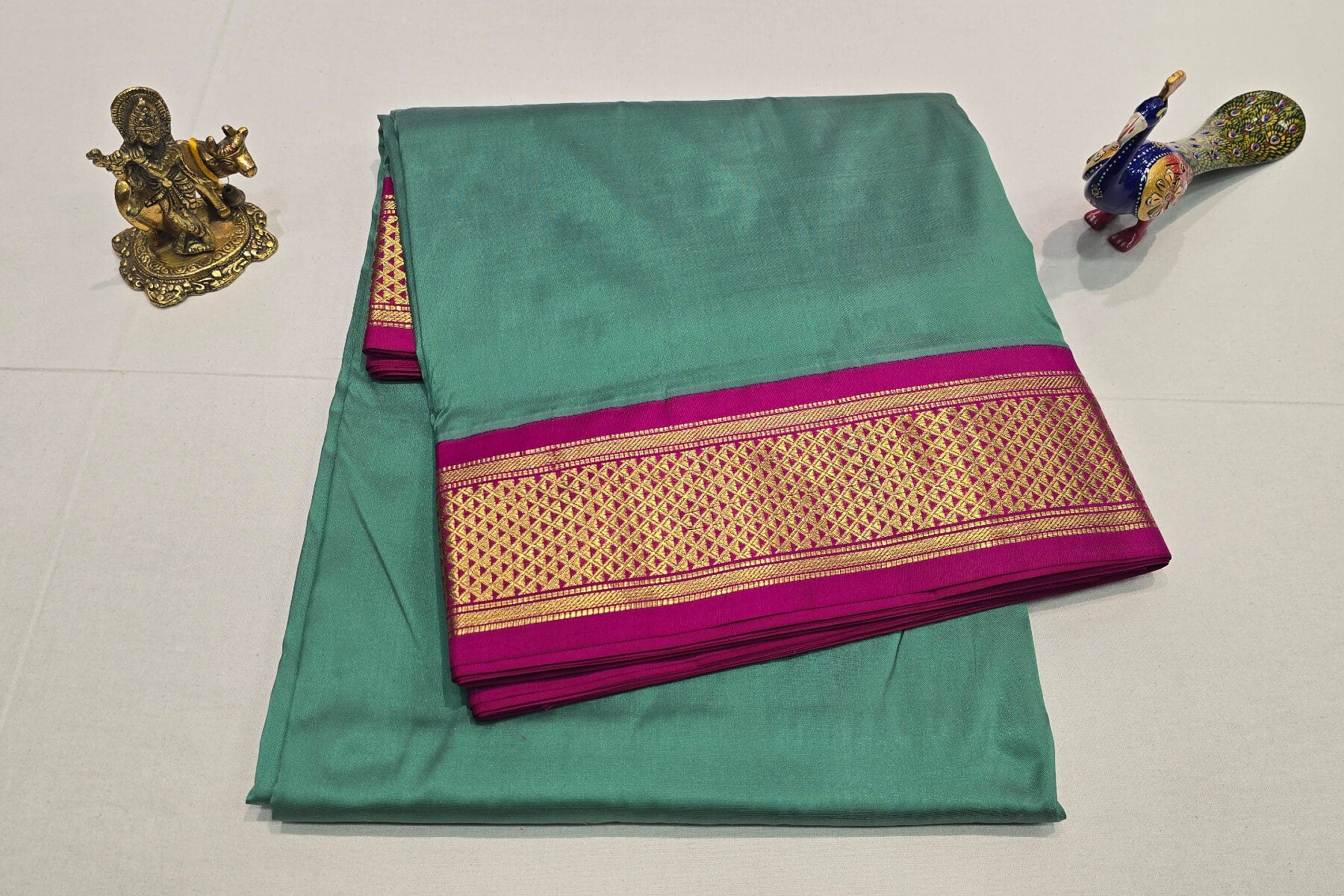 This elegant ten-yard Madisar silk saree features a soothing pastel green body complemented by delicate pink borders and paloo. Crafted from premium silk, it offers a graceful drape and timeless appeal. Designed without a blouse piece, it invites you to pair it with your choice of blouse for a personalized touch. Perfect for traditional occasions, this saree blends classic charm with refined sophistication.