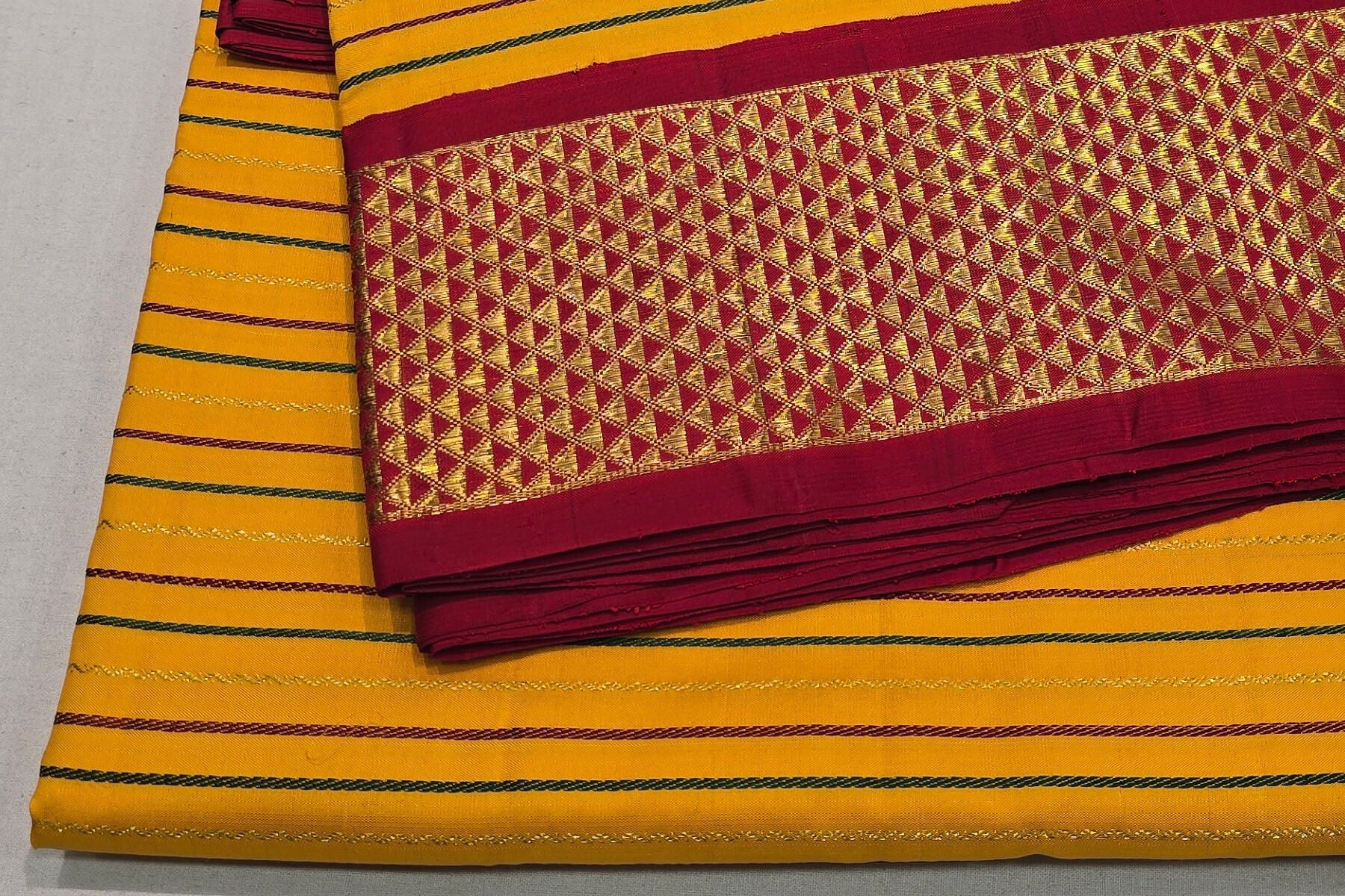 This sophisticated 10 yards madisar silk saree features a bright yellow body beautifully accented with vibrant red borders and paloo. Included with a matching blouse, it offers a complete traditional ensemble. Crafted from premium silk, this saree combines vivid colors with classic elegance, perfect for ceremonial occasions and cultural celebrations.