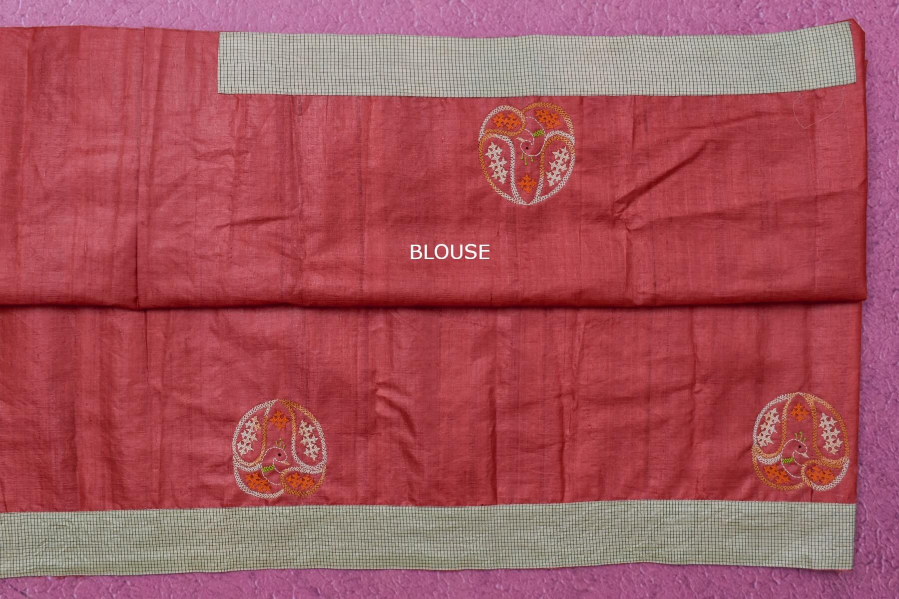 Expertly crafted, this tussar silk saree (SH030) features stunning red patch work. Known for its unique texture and lustrous sheen, tussar silk elevates any outfit with its luxurious feel. Make a statement at any occasion with this elegant and timeless saree.